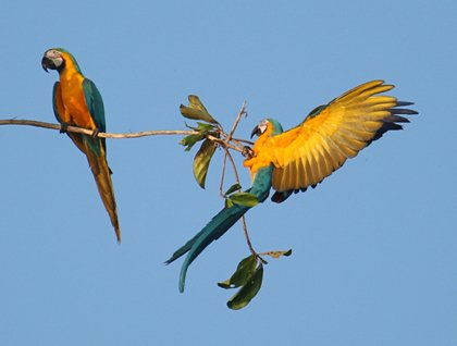 Camaras, binoculars, big smiles and anxiousness to explore were spotted on every guest! The cool morning breeze was felt as we began to approach the river bank. Several aguaje palms were easily seen. Suddenly, blue and yellow colors were identified among the green of the forest.  Immediately the sounds of clicking cameras filled the air! A big flock of blue and yellow macaws were painting the blue sky. These were not the only macaws seen here. A small group of scarlet macaws also flew by together with red bellied macaws. The smile of joy and delight was seen on each of the guests.