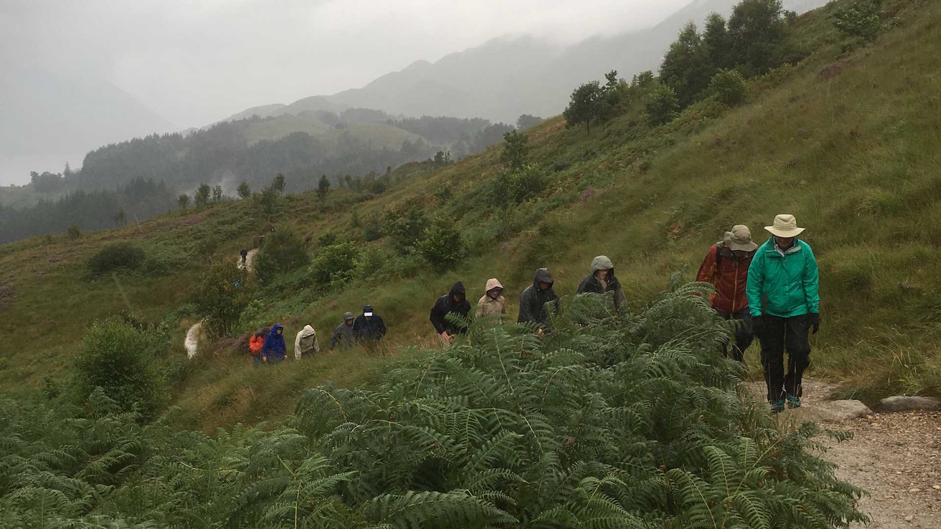 We also had the option of a gentle nature hike with David and Stewart. Or for those that wanted some more exercise Brian (the hotel manager) and Konia offered a hike from the train station past the famous Glenfinnan viaduct (which was built in 1901 and is now famous because of the Harry Potter movies) to the Visitor Centre. Despite the first rain on our trip (!), we all enjoyed the scenery with the heather in full bloom–really bonnie! And yes–we had a lovely time, but we had to look at our feet as we walked–see picture!