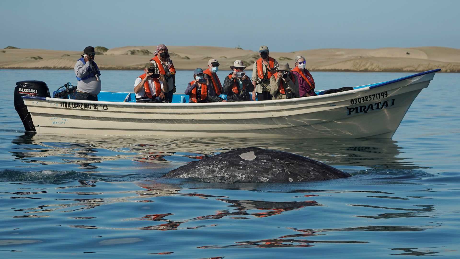 Everyone hopped into local pangas. The local panga drivers know these whales, and they carefully maneuvered the vessels through calm and rough waters to provide guests with great views. Almost immediately, we saw a gray whale mother with her newborn calf. This gray whale mother was observed without a calf three days ago, so we knew this was a newborn baby.