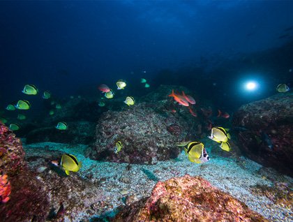 Despite the roll of a persistent north wind swell, we found protection on the south side of a tiny islet just north of Isla Partida. Once mistaken for a snow capped red rock spire, Los Islotes is home to hundreds of seabirds who paint the rock with their blanching guano and another hundred or more California sea lions down at the water’s edge. Undersea specialist Ian and I went for a dive to explore the exposed western side of the island and encountered clear water dotted with thousands of feeding fish. We kicked against a strong current towards the crashing swell as barberfish (butterflyfish), creolefish (anthias), yellowtail surgeon fish, and many other species fed on drifting food on the incoming current. Even cup corals had their neon yellow tentacles extended, swaying in the nourishing currents. Nestled amidst the convoluted branches of a giant sea fan, we found a mated pair of long-nosed hawkfish, a personal favorite replete with red reticulated pattern and a curiously long snout.