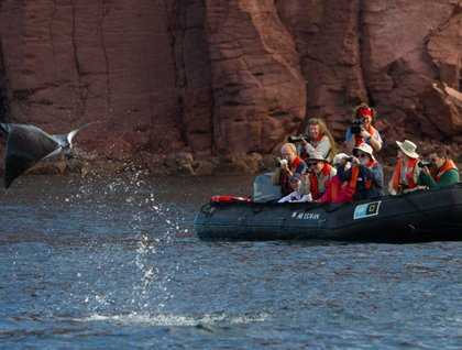 We began our activities immediately after breakfast, with a series of expedition landing craft tours around the islands, with short escapades to appreciate better the Thurston’s devil rays or “mobulas” jumping out of the water in unsuccessful tries to fly! Oh, they flipped out of the water and showed us their black backs and white bellies, at times, one after the other, or even in groups of three together.
