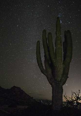 After lunch, the National Geographic Sea Bird anchored in the beautiful crescent-shaped Bahia Bonanza at the south end of Espiritu Santo. Wow! Eager feet met white sandy beach. A few yards above the shoreline, the sand turned into tide-softened pebbles and shells. Several yards further the land opened up into cactus-strewn scrub desert, with hills and mountains yet further back. Explorations of land and sea ensued. Naturalists led walks through the desert, with the longer hike going up along a ridge line. People donned snorkel gear again and floated along rocky outcropping. The crew brought kayaks ashore and people paddled against the wind around a point to another cove area, and then got a bit of a ride back with wind and incoming tide. Late in the afternoon, the crew brought over chairs and tables and all manner of food and drink for a barbeque feast ashore. The air cooled as the sun dipped behind the mountain, and clear skies promised a good star show. At this writing, many are still ashore gazing at stars, trying their hand at night photography, and sitting around the fire sipping a brew and munching on s’mores and mudslide cookies.