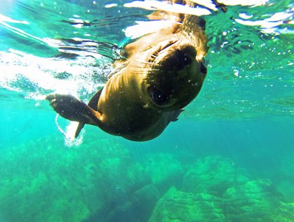 After our morning cruises, many bold travelers donned wetsuits, grabbed their underwater cameras, and spent the rest of the morning snorkeling with the sea lions. Most were playful, nipping each other (and sometimes us!), scratching themselves by contorting their agile bodies into a perfect circle, or darting toward us before flipping under and swimming away, only to come back and do it all over again. A large male sea lion wove his way around his fellow swimmers, always staying just far enough away from us. A cuddle pile of sea lions draped themselves across the rocks—and each other—at the bottom of the sea floor. Every so often, one spiraled up to the surface, flipped toward us and dove back down again.