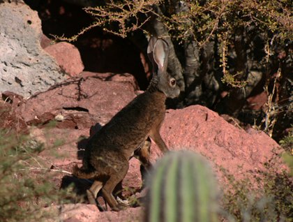 Hiking led some of us up one of the great wide ravines of pink rock (compressed and fused 30-million-year-old volcanic ashes) that formed layers like any good sedimentary rock. The vegetation is formed by dozens of green bushes and some trees, as well as different cacti and tall cardones, that tallest of all cacti in the world (of course, the New World, home to the members of this interesting plant family). The path wends its way among huge boulders and spiny bushes, making us walk carefully between them! Here Adrian had the almost incredible opportunity of finding a black jackrabbit and using his camera to its maximum potential. It is definitely very difficult to photograph these shy animals in the wild.