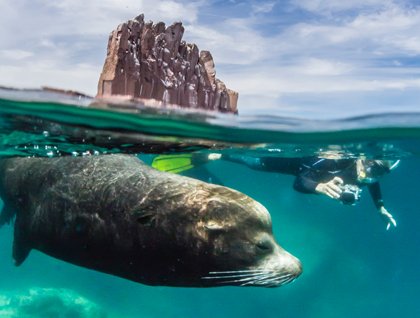 Dawn exploded with color early this morning as National Geographic Sea Lion found herself safely anchored off the tiny islets known in Spanish as Los Islotes. As the sun rose higher in the east, the nearly full moon set in the west. We cruised around the tiny islets in our inflatable fleet, stopping to enjoy the sight, sound, and even the smell of the southernmost breeding colony of California sea lions here in the Sea of Cortez. Magnificent frigatebirds, brown and blue-footed boobies, yellow-footed gulls, and brown pelicans wheeled in the skies above us. The water was incredibly clear and called to us to jump in and play…so we went back to the ship to gather our snorkel equipment and returned to get wet with the sea lions!