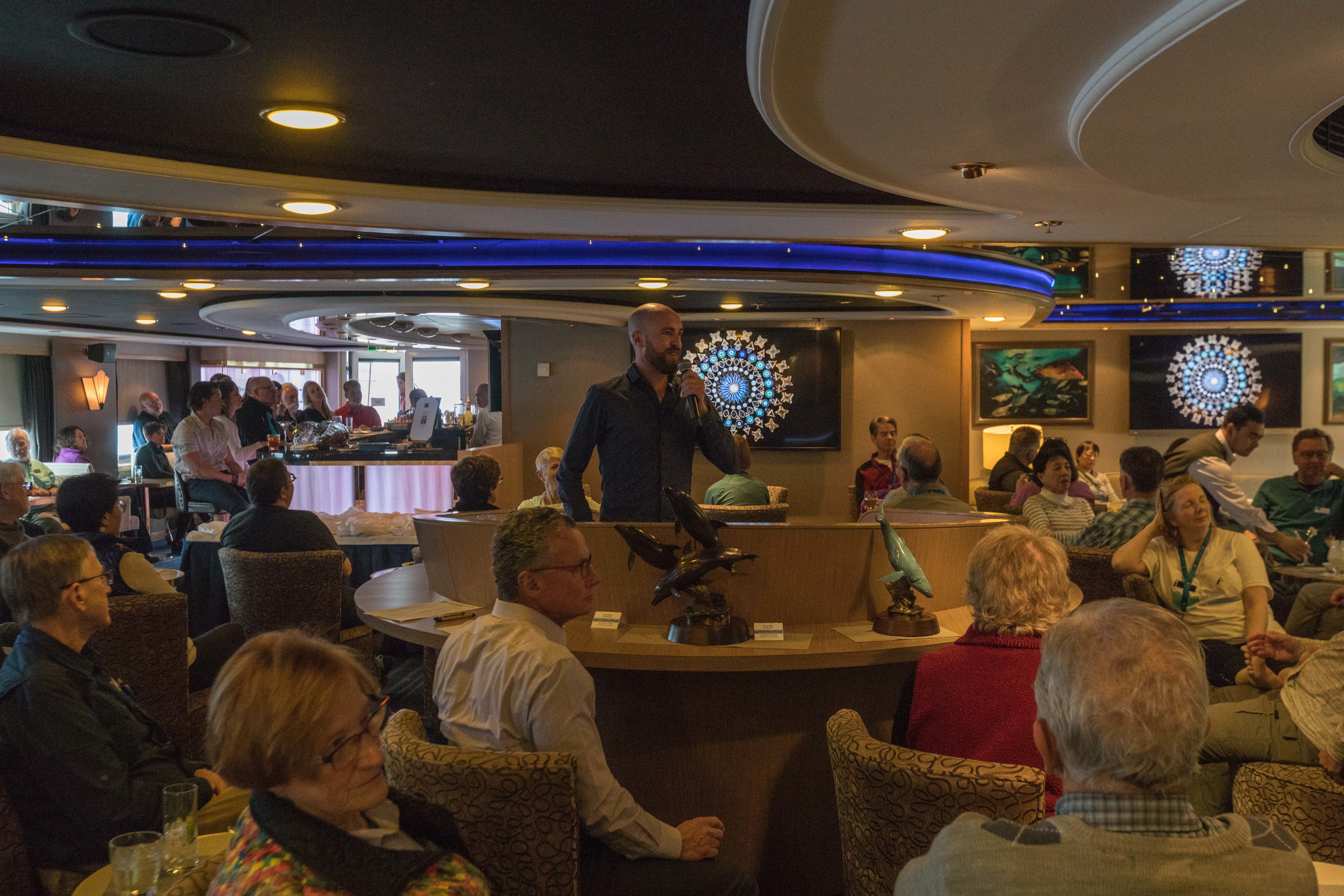 Today we woke up sailing along the picturesque coastline of the Baja peninsula. We had high winds and so while the seas were spicy, spirits were high as we sailed over the ocean. Seeing the waves crashing against the bow is a remarkable sight, and the feeling of exploration was palpable. We had an incredible presentation by our undersea specialist, James Hyde, on the incredibly intricate and fragile topic of plankton. Filled with beautiful videos and a wealth of knowledge, we were moved by the importance of this biodiverse and beautiful part of the dance of the ocean. Closing his presentation, we toasted to an exciting day at sea with bloody marys. One of our bartenders, Derek, served them up in a beautiful style while we lounged and enjoyed the seas. These weeks are so jam-packed with activities that it was a true gift to enjoy some downtime. Our photography instructor, Shayne Sanders, was available in the lounge all day to help with photo transfers and to continue teaching us the tools we have been learning all week to improve our photography skills. This could not have come at a better time, as we were soon treated to a mega pod of common dolphins. To see the ocean alive with dolphins all around the vessel was an unforgettable experience. We all leaned over the bow and watched as dozens of dolphins squeaked and rode the ship’s pressure wave. All this before lunch! We then continued to the entrance of the mouth of Magdalena Bay. We began seeing the blows from gray whales as we entered the calm and protected waters. This was an incredible day that showcased the magic of the Baja coastline.