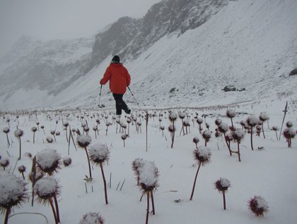 Summer certainly looks very different than other places here in South Georgia. Something along those lines was what many of the hikers thought this morning, as we landed in Maiviken. This whaling cove, discovered in 1902 by the Swedish South Polar Expedition, was today blanketed by soft and dry snow. As we readied ourselves for the hike over to Grytviken, the snowfall intensified and made for some challenging initial climbing up to the main plateau. The morning was however calm, silent and spectacular, with the occasional break in the clouds providing winter like light over the hills and lakes. After a couple of hours, we descended into Grytviken to join the rest of our group at the cemetery for a toast to honor the ‘Boss’ and his right hand, Frank Wild.