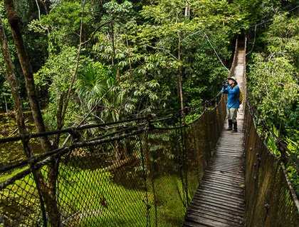 Dry land, or Tierra Firme, is a rare thing in the Amazon this time of year, and places to hike are hard to find. This morning we visit a private nature reserve called the Amazon Natural Park known for its lush forest and swinging bridges. The adventurous among us follow a winding tail where we see a variety of interesting trees, birds, and a rare sighting of monk saki monkeys high in the canopy. The highlight of the morning is crossing the swinging bridges through the rain forest canopy. Thoughts of Indiana Jones and great explorers run through our minds as we cross step by step, taking time along the way to enjoy the unique perspective.