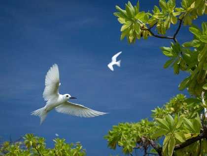 With great anticipation we headed off by Zodiac through “Blind Passage,” the only navigable route into the atoll’s inner lagoon. This morning we took our time, stopping first on South Island to find coconut crabs and a monument commemorating the dawning of the new Millennium. We then wove our way around coral patches across the lagoon. At Motu Ana Ana we encountered a lone French sailor named “Lyderic” who has camped here for several years accumulating piles of flotsam from the atoll’s wild shores. Inland through thick brush we found the remains of a once elaborate wooden hut where a family named Falconer had lived alone for four years in the late 1980s like a modern Swiss Family Robinson. Overhead, dozens of white terns and noddies fluttered above the trees. On adjacent motus, red-footed boobies and great frigatebirds were actively nesting. Of special interest were sightings of blue-gray noddies, and also bristle-thighed curlews which are masters of transoceanic migration.