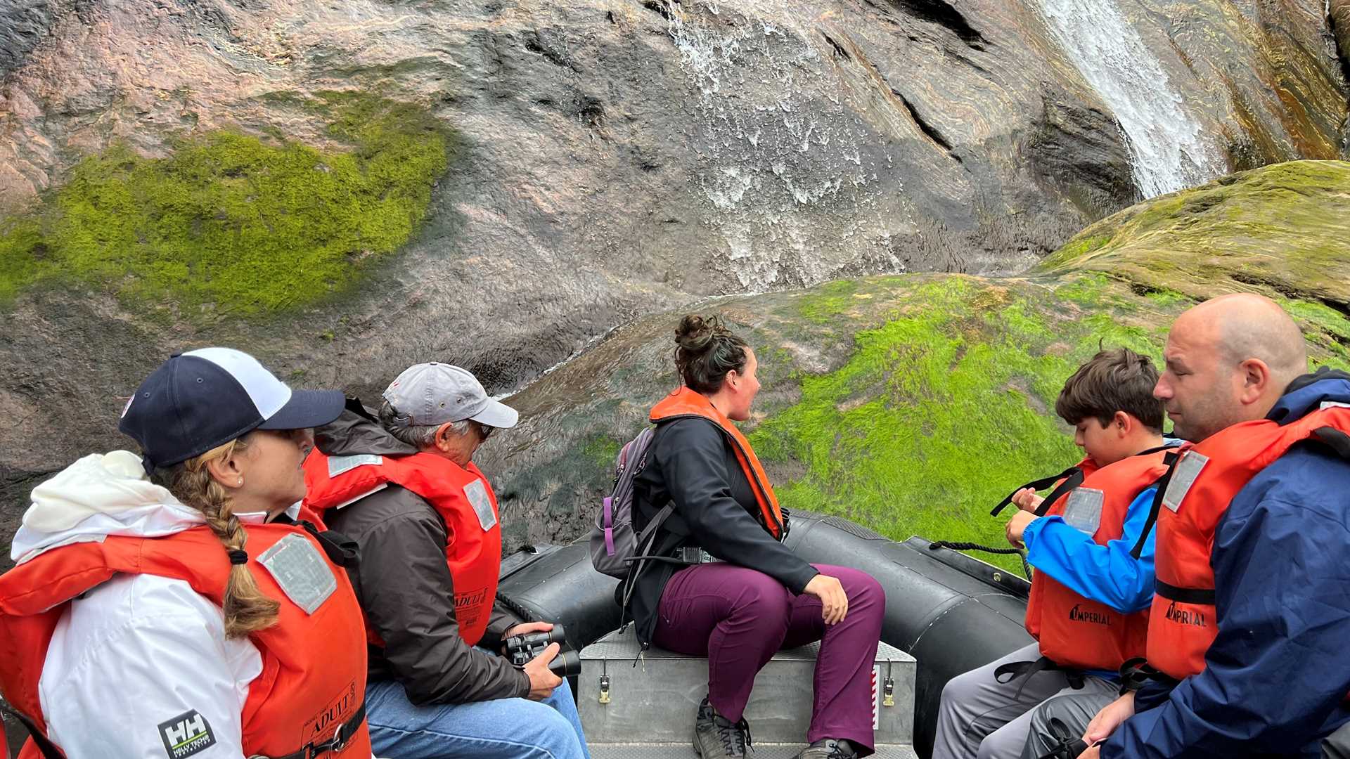 Towards the back of Rudyard Bay, there is a very narrow passage called Owl’s Pass. Owl’s Pass is named for the rock formation inside of it, which is a result of exfoliation. Arches formed in the granite wall give the appearance of an owl’s face. The Zodiacs took off through Owl’s Pass and explored the back of Rudyard Bay. Zodiac cruises were able to go right up to the waterfalls and make their way into the salmon stream, finding harbor seals along the way.