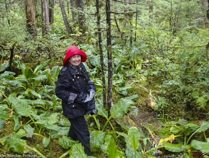 Loops of pale olive old man’s beard lichen decorated the spiky branches of Sitka spruce and beckoned our walkers to enter the green cave of the temperate coastal rain forest at Ideal Cove this morning. The dense growth of the forest enveloped each group of walkers as we cleared the last downed log and set off along the boardwalk. It’s fall, most definitely…raindrops dangle off ruby red high bush cranberries and red huckleberry; most of the blueberry crop has been consumed by the bears and previous hikers. Shiny fungi caps have popped up here and there—and oh boy!—my personal favorite, sulfur shelf or chicken of the woods was a delightful discovery. The soft outer tips of these young fungi are a wild Southeast Alaskan delicacy. Across the creek the large maple-shaped leaves of Devil’s Club are turning orange and yellow. Signs of the changing season are all around.