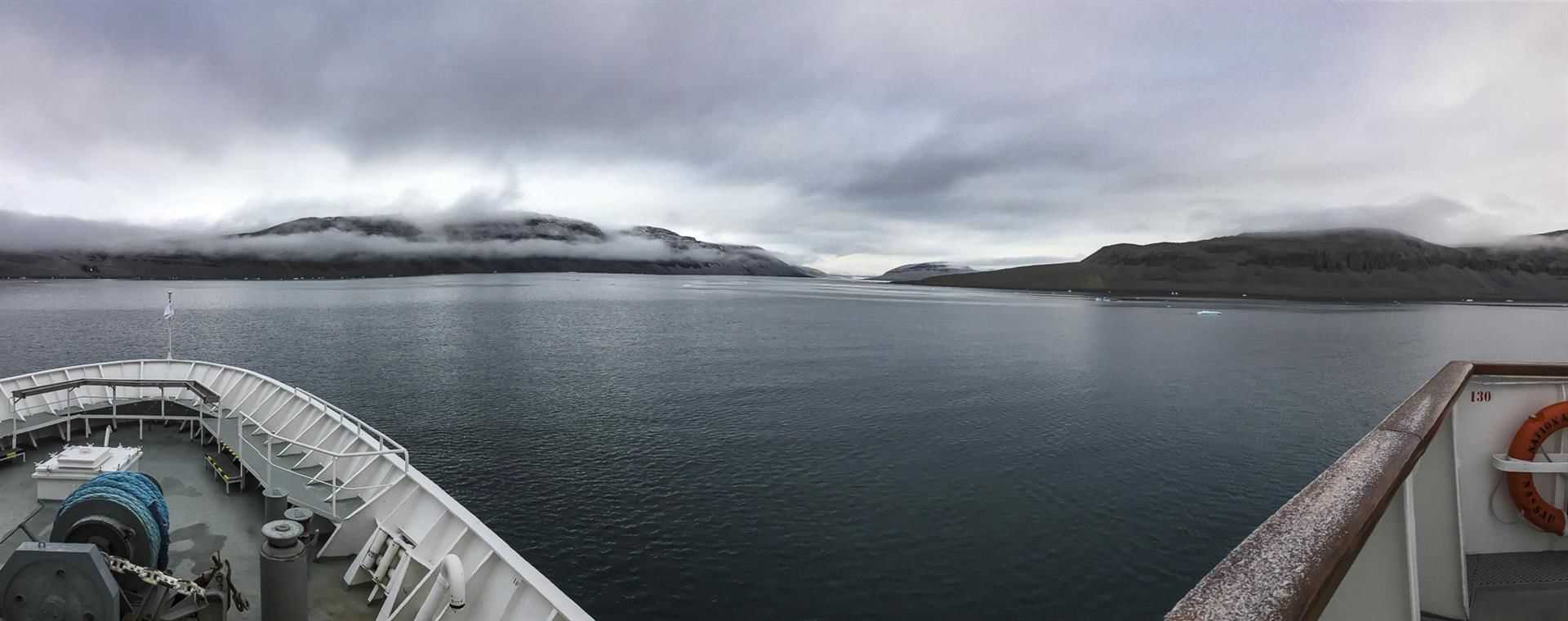 During breakfast, Expedition Leader Russ Evans took a scout boat ahead to see if the walrus we hoped were hauled out just inside the entrance to Musk Ox Fjord were indeed there. They were, and the expedition team began to prepare for a landing. But before the first staff boat was even lowered, the walruses had all moved into the water for their breakfast, and a visit to the beach was deferred to a later time.