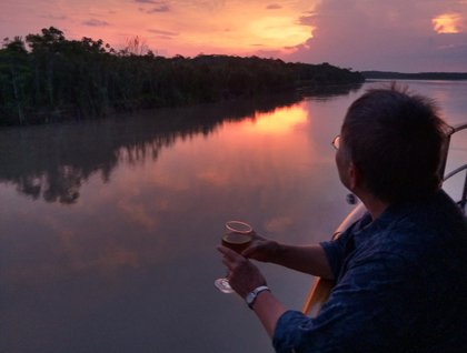 We were not finished with the river yet, as it became a spectacular reflecting glass for the colors of sunset.  With a glass of wine in one had, and the sky on fire ahead of us, we too became reflective of our experiences of today along the tributaries of the Amazon River.
