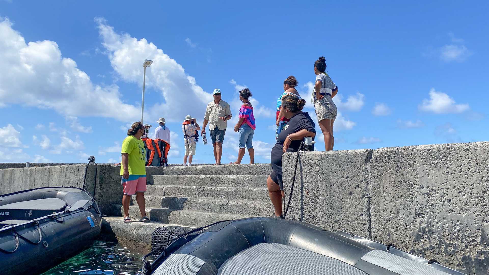 We had to be very patient today to catch our first glimpse of the Marquesas Islands. Winds and swells delayed our arrival in Nuku Hiva. In the meantime, guests enjoyed time on Deck 6 looking for wildlife. Tropicbirds and petrels soared through the sky, and flying fish jumped out of the water to escape their predators. Once we approached the island, the impressive landscape of Nuku Hiva overwhelmed every single person onboard: steep cliffs rose out of the ocean, and spectacular rock formations towered over the tiny village of Hatiheu. From far away, our guests could hear the traditional welcome song, “Mave mai”. All-terrain vehicles waited on the pier to take the first group, the “birders,” high up in the valley. They were looking for the endemic Upe, one of the biggest pigeons in the world. And there they spotted not one, not two, but eight imperial pigeons sitting in one single tree. What a fantastic sight! The second group of guests, the hikers, enjoyed a walk up to the archaeological site of Kamuihei. En route, they passed through the lovely village. Hibiscus flowers in many different shapes and colors ornament the street. Hatiheu is like an open-air museum. Numerous paepae, stone platforms for house foundations, and tohua, ceremonial sites, are found throughout the valley. A gigantic banyan tree protects the most sacred area, the me’ae I’ipoka. Hatiheu also has the best known petroglyph boulders in the Marquesas Islands. Archaeologists studied these rock engravings over many years. Besides human figures and faces, many boulders show animals like dogs, fish, and turtles. After this archaeological exploration, we all walked down to Hikokua, an ancient festival place in the valley. As in the old days, a group of young Marquesan men and women entertained guests with songs and dances. The most famous Marquesan dance is the “pig dance.” The men imitate the grunting of this animal and simulate daily activities such as making copra, taking a shower, or fishing in a canoe. As Marquesan people like to share their culture with all visitors, they invited guests from National Geographic Orion to join them. Fun on all fronts! After these activities, guests appreciated a fruit tasting at Yvonne’s Restaurant in the village. Delicious mangos, papayas, pineapples, bananas, watermelons, and freshly squeezed lemonade contributed to our excellent first experience on one of the planet’s most remote islands.