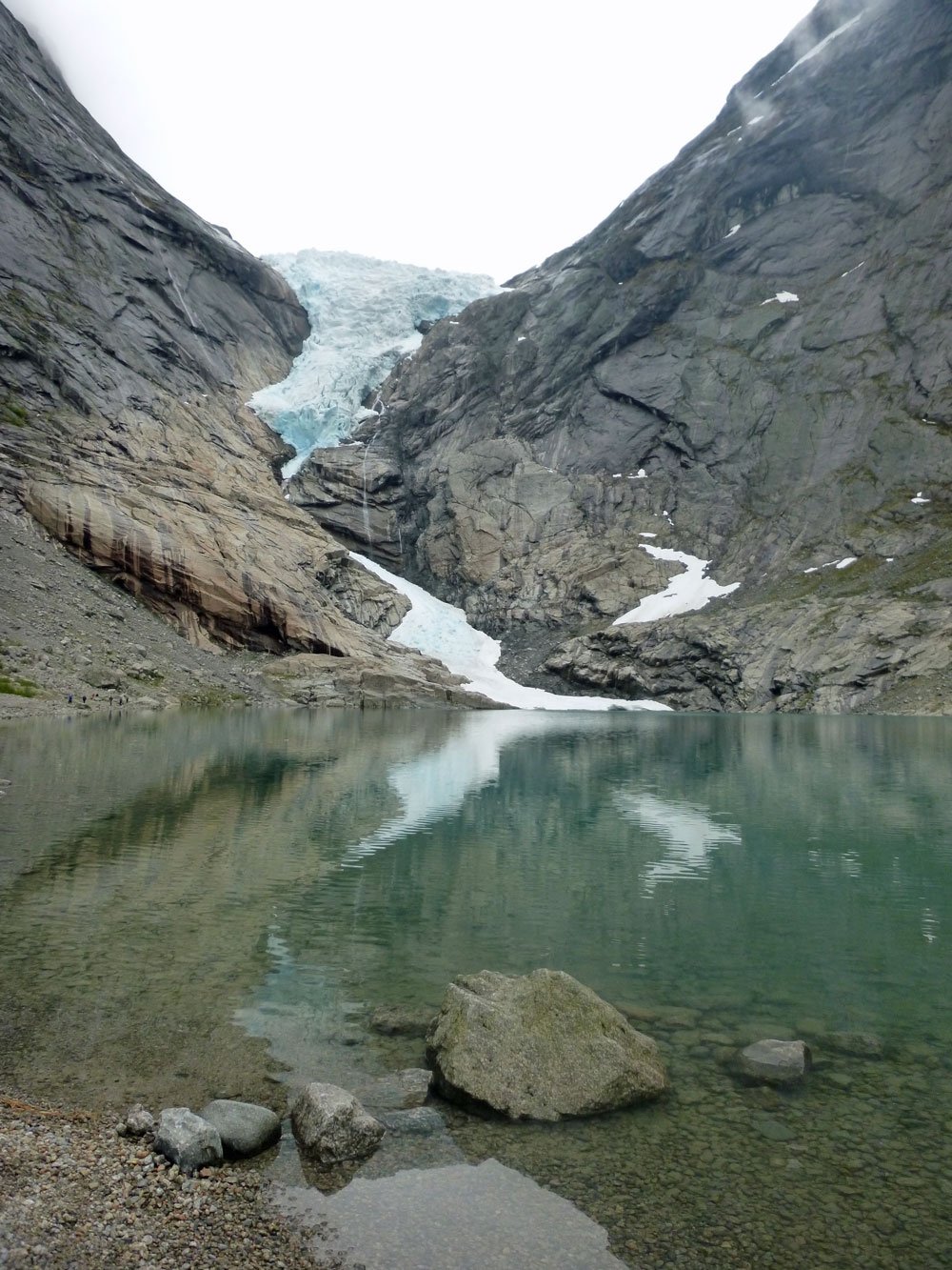 The source of most of this water is high up in the mountains. A lot of this is snow that has melted as spring progresses into summer, but the most significant source is the Briksdal glacier itself. At the end of our trail it hangs over a lake that has formed from meltwater. The lake itself is a recent development, having been cut by the glacier prior to it receding dramatically in the last few decades. This is a very explicit reminder of the increasing rate at which Norway’s climate has gotten warmer in recent years.