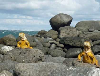 Blue-footed boobies waited for us in the middle of the trail, a male stopped and pointed his bill upward to be seen by a female that was flying right on top of him. She understood his move and landed right next to his side. As she approached him, he started whistling at her - definitively courting, it is that time of the year! Land iguanas waited in the shade of the Opuntia cacti, highly likely hoping that the fruits of the pads will fall on top of them. The cacti here are their only source of water. One walked in front of us and decided to rest under the cactus next to the trail. As the morning got hotter even the reptiles looked like the breeze near the ocean was a good place to rest.