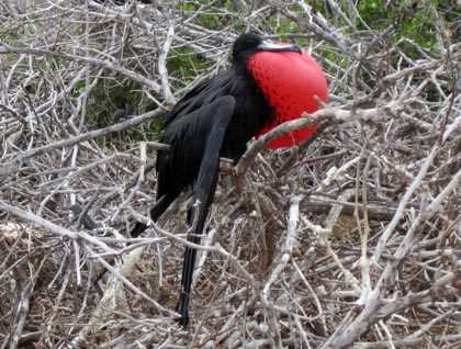 Located at the central part of the archipelago, North Seymour and Rabida Islands offer a great number of attractions, not only from the point of view of marine life, but also geologically. We were fortunate to have excellent weather conditions today, and after breakfast we headed to North Seymour, a small and flat island which is home to thousands of sea birds. From a distance it looked dry and barren, covered with dry vegetation, but walking inland we observed how different and unique this place is. Land iguanas, blue-footed boobies, magnificent and great frigatebirds were delightful to our guests, who observed many different chicks with their fluffy feathers and male frigatebirds with their inflated red sacks, producing unmistakable calls, trying to obtain a mate. Heading inland, we encountered frigatebird chicks awaiting a meal from their parents, as they sat atop rickety nests that appeared to fall apart as they rested upon them. Land iguanas slowly moved in and out of the dry brush, and we came upon one that was trying—unsuccessfully—to rip apart a pad from the opuntia prickly pear cacti. We began to understand the complex process of evolution that began millions of years ago, and the poor conditions that these creatures had learn to survive, after an accidental arrival from the mainland.