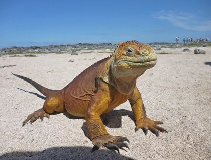 North Seymour Island is located in the central realm of the Galapagos Islands, and it is a small island compared to others. This island is one of the best spots to find great and magnificent frigatebirds in their breeding grounds, and it is also the home for Galapagos land iguanas. We disembarked the ship and started the day with a walk along the trail, where we observed small forest of Galapagos incense trees. At this time of the year, these trees are starting to get leaves and flowers, creating a sweet scent that lingers in the air, attracting land iguanas who depend on this good source of food. Along the path, we found land iguanas, lava lizards, and several male frigatebirds displaying their red inflated gular pouches to attract mates, while the females flew overhead, looking down to select an attractive partner. Both species were observed here, the great and the magnificent.