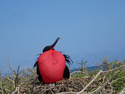We were not disappointed, and several male frigates were seen during our outing, with their bright red gular pouches fully inflated. As soon as they spotted a female, the males made a lot of noise and flapped their wings very quickly, hoping to get her attention. As we hiked back to the coast, we encountered Galapagos sea lions relaxing on the shore, as well as courting blue-footed boobies, doing their typical mating dance which includes marching, sky pointing, and long mating calls. After a while, we saw a female being called by three different males, and when we left, she had still not chosen her mate. At the end of the walk, we saw a female sea lion nursing her pup right at the dock, and we had to walk quietly around them so we could get on to our Zodiacs.