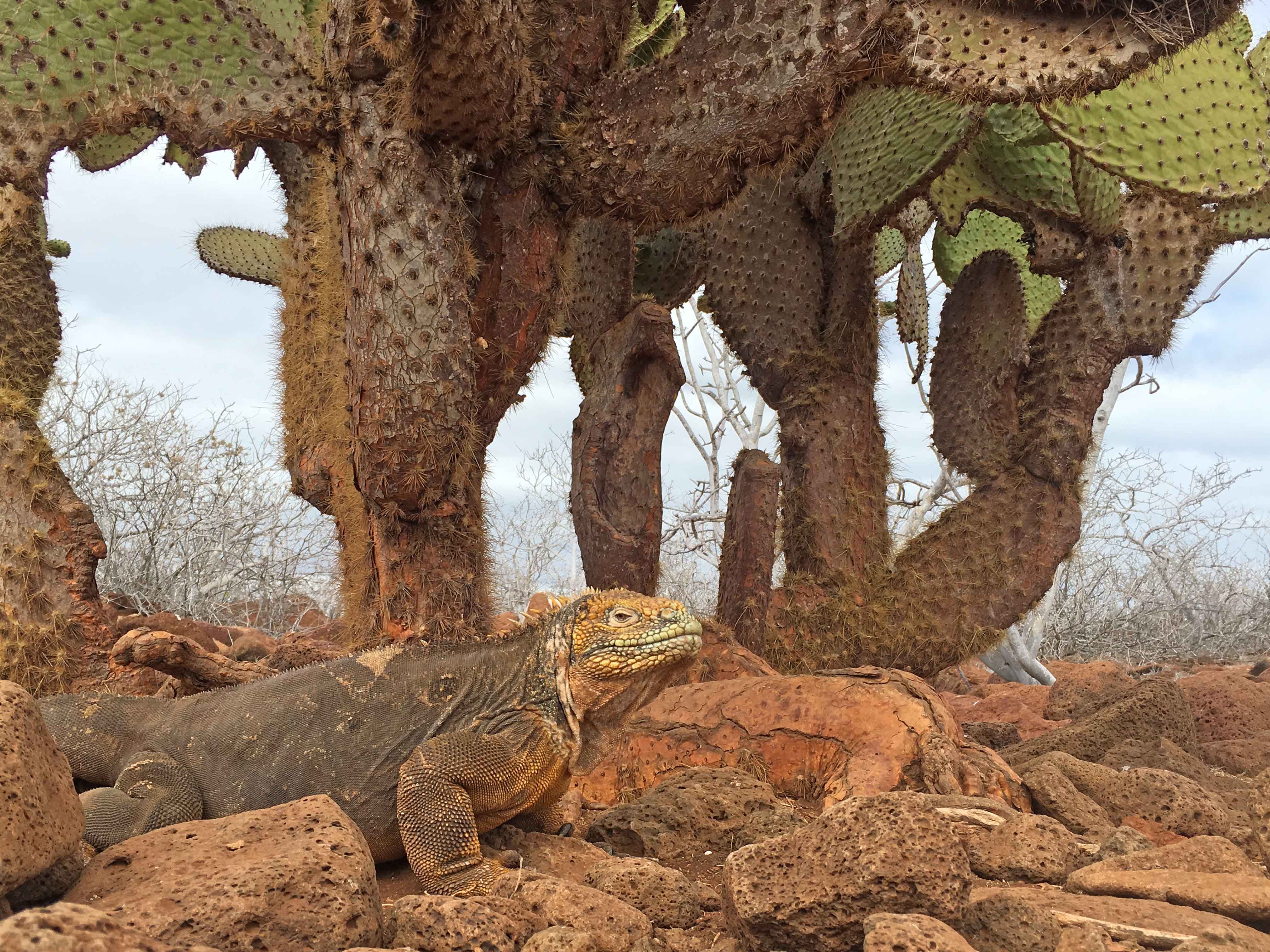 Today we awaken close to where we arrived at Baltra Island. It is incredible to see the difference from one island to the next with such a short distance traveled in-between. As we land at North Seymour we have an incredible amount of air traffic above us with magnificent frigate birds, brown pelicans, blue footed boobies catching the updrafts of wind as it comes off of the ocean. As we move over the rocky terrain we start to find nesting areas for frigate birds and blue footed boobies with the occasional Galapagos land iguana lumbering about. Blue footed boobies are very productive at this time of year as the main productivity in the ocean is quite high. We find adults with various chicks in the nest with an occasional juvenile asking for food from the parent. Male frigate birds with their inflated gular sacks are trying to attract females that fly overhead. As we stop upon the trail to observe a land iguana, the land iguana walks zigzag through the entire group and slowly moves into the underbrush. This desert lake terrain is otherworldly as we walk among the Palo Santo incense trees. As we head out to the outer coast we find one of the densest breeding areas for frigate birds in the Galapagos with over 100 adults and juveniles grouped together in front of the coast. Galapagos sea lions lay upon the sandy dunes with an occasional pop searching for its mother so it may nurse. As we return to the ship the low lying clouds start to rise and show us the sun.
