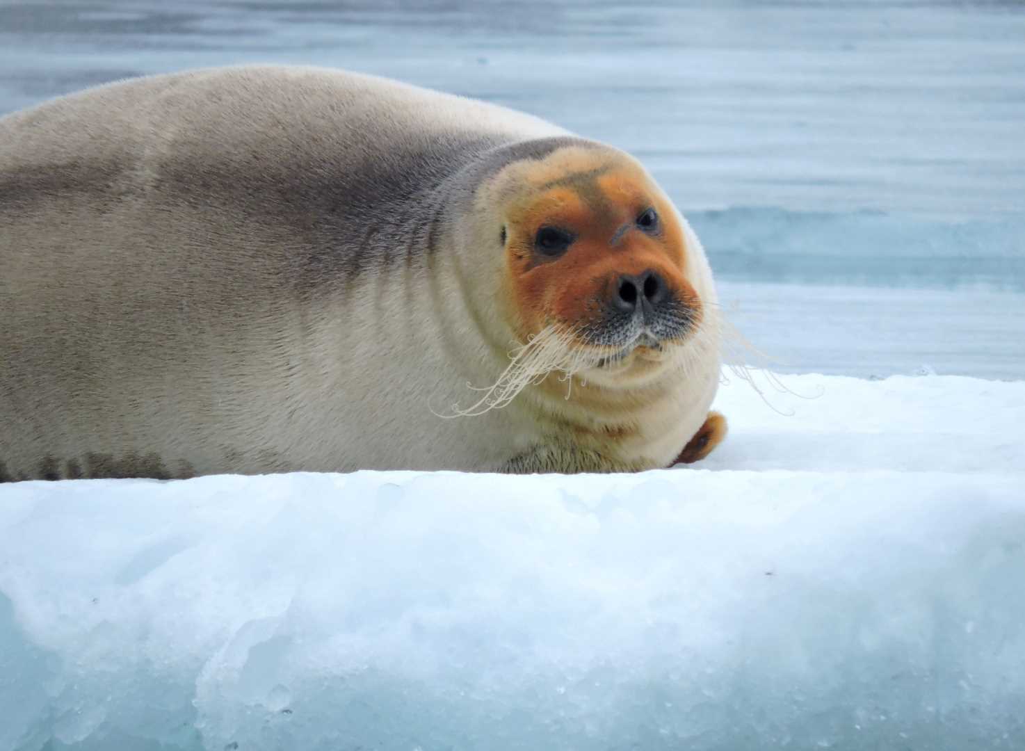 A couple beluga whales and several bearded seals were also observed in the area. One bearded seal (which actually has a moustache, not a beard) was observed on an ice floe and seemed happy to pose for photographs. Individuals of this species often develop a rust-colored face as they nuzzle about in the iron oxide laden bottom ooze and silt looking for food (Figure A). Most people seemed fascinated with the shockingly blue icebergs and bergy bits that had drifted and concentrated to one side of the fjord.
