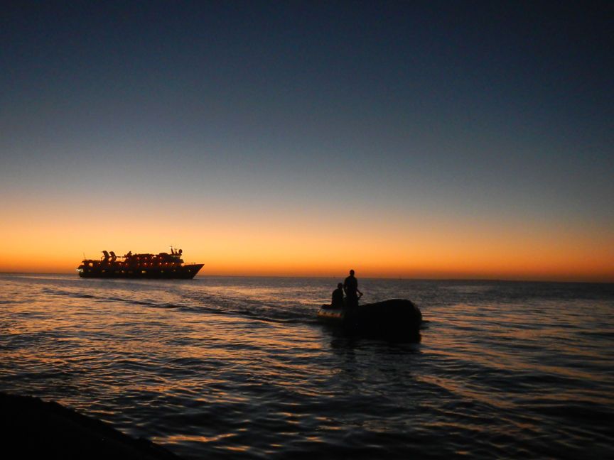 On arrival on the beach those of us who wished to snorkel followed Patti and Ian and the swimmers remained with Tom Heffernan. The snorkelers saw literally reefs of fish, lobsters and Moray eels. The beach at Chatham Bay has a few classic and famous “Rum Shacks” run by “Shark Attack” and “Boll Head” and they are their names! The snorkeling was very good and the sea was inviting and warm. Where I was swimming I saw an occasional brown booby, pelican and laughing gulls diving in the bay for fish. We lay on the beach and after an appropriate amount of sunning we gravitated to the “Rum Shacks.” The hills of Union Island rose up before us green and lush and the tropical sea was aquamarine. The last zodiac to leave the island was full at 6:20 PM and I suspect few wanted to leave as the sun began to set in the west!