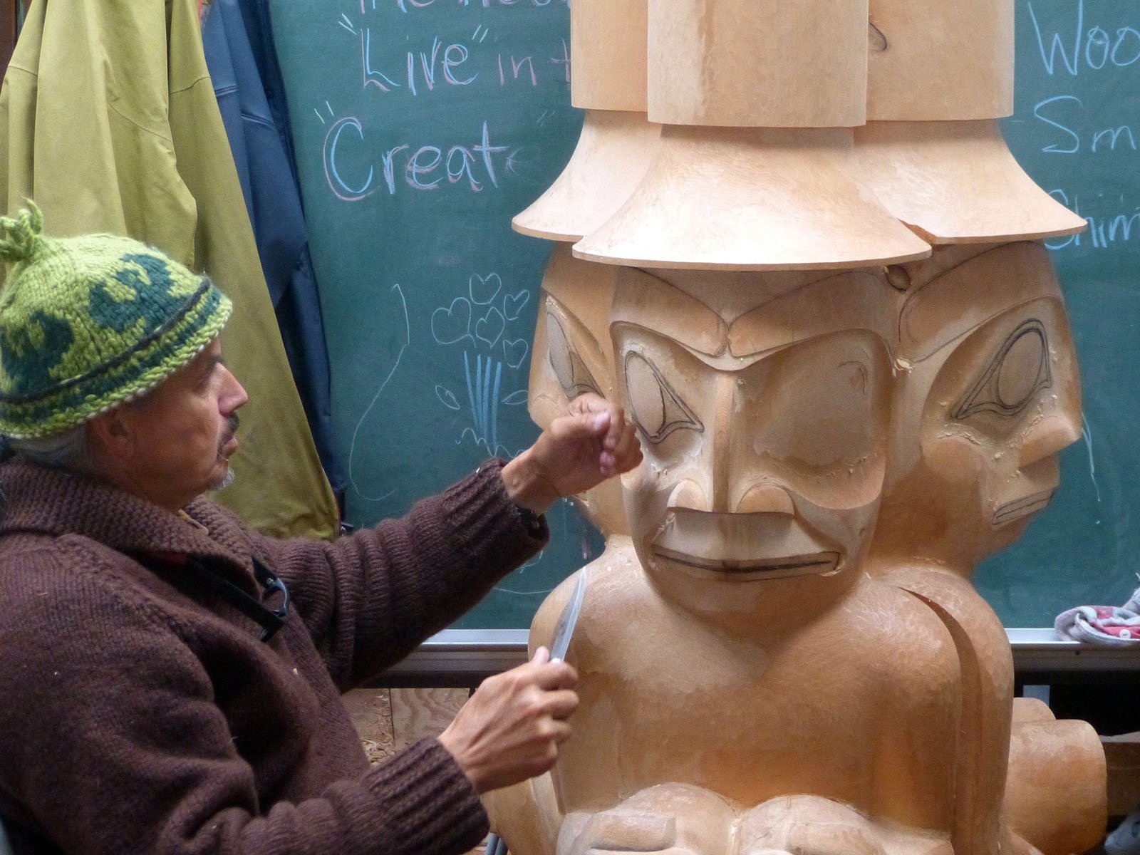 We boarded the Haida Gwaii version of luxury transportation and headed north over the only paved road to reach the community of Old Massett.  It is the center of a resurgence of Haida culture that began in 1969 when the first totem pole to be erected in over 100 years was raised here.  Now, a number of widely recognized carvers, artists, and canoe-builders live and work here in Old Massett, passing on their traditions to the next generation.  One of the carvers is Jim Hart, known by his Haida chief name of Uidansuu.  He holds a hereditary chiefdom, which, by Haida tradition in this matrilineal society, was inherited from his maternal uncle.  We found him, with his son, working on a large pole, carved in the round from a Western redcedar log.  Haida art is evolving, and this pole is an example.  It is carved in traditional form line design, but the theme is one of reconciliation, as the Haida struggle to recover from the dark days when their children were taken from their home communities by the government and sent away to boarding schools in an attempt to exterminate their language and culture.  (The Canadian government has formally apologized to their First Nations people for the abuses of this era.)  The pole includes an image of the government school, not exactly a traditional design feature.  All the while, as he described the pole and the carving process, Uidansuu and his son continued their work.  When it is completed next month, this massive pole will be erected in Vancouver, a process that will take some 800 people pulling on ropes, and culminate in a grand celebration of Haida culture, all under the supervision of the chief.