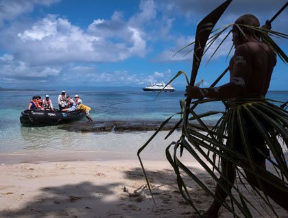 As people of an oral culture, the Melanesian people who live on this island have preserved traditions by passing along the stories of their ancestors with performances. Thus, each arriving Zodiac was greeted with an “attack,” as if protecting their island from potential marauders or spirits. We came ashore through floral decorations and gathered in the shade at the edge of a field. We listened, watched, and photographed the men making music by slapping the ends of pipes made of bamboo and PVC with remnants of old flip flops, while others played panpipes. Women danced in colorful attire adorned with flowers, plants, shells and dogteeth necklaces.
