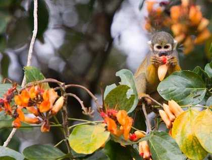 On both of our skiff rides today, we didn’t go more than a few minutes without seeing some sort of monkey. Multiple groups of brown capuchins used their prehensile tails to move through the treetops. Large, black, and fuzzy, Monk saki sat on huge horizontal branches. Small saddleback tamarins ran through the trees like squirrels. And the large red howlers not only greeted us from afar with their calls, but climbed  to the tops of trees to watch the sunset. By far the most abundant, however, were the squirrel monkeys.