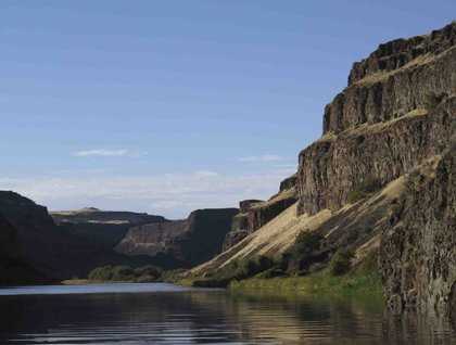 On our way to the Palouse we enjoy lunch on the sundeck and some stunning rock formations to go with it. At the Palouse we are soon off on our various activities. A flotilla of yellow kayaks is launched while others board a yellow school bus for the short road trip to magnificent Palouse Falls. Here the river plunges over a basalt cliff, nearly 200 feet into its green plunge pool before flowing through the deep gorge of its canyon. A small rainbow appears in the mist over the plunge pool. On the river we cruise along enjoying the scenery. Great cliffs formed of basalt loom on either side, beautiful in the bright sun and ever-changing in their appearance. Western grebes swim near us while ravens play on the wind rising up along the cliffs. Upriver we are surprised to see a great egret fishing at the edge of the water while a flotilla of American coots, all dark with white bills, swim nearby.