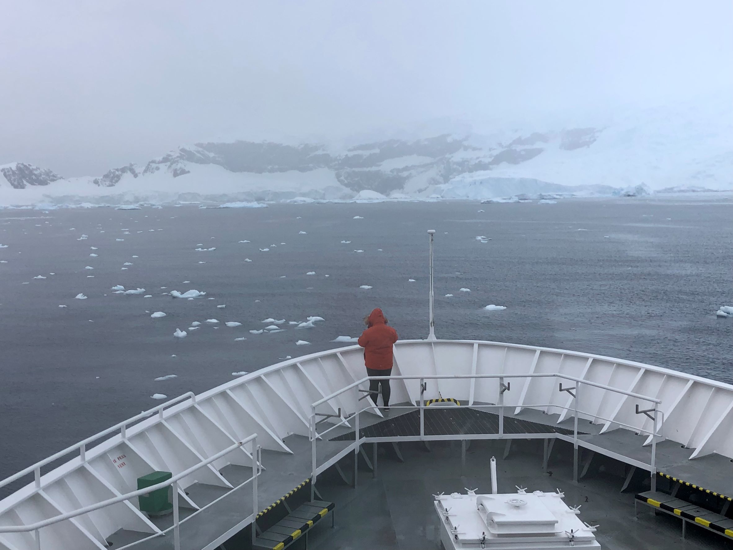 We woke up to cold snowy weather! It had snowed several inches overnight, so the deckhands were clearing the snow off the decks for us. The high winds prevented us from our original landing at Neko Harbor, so National Geographic Endurance moved over to nearby Paradise Harbor for our morning activities. We went on Zodiac tours in two rounds, launching into very wavy conditions. We rode the Zodiacs into a surprisingly calm bay at the base of a huge tidewater glacier. It had a 100-foot glacial face, with blue crevasses and white serracs. All around us were dozens of large blue and white icebergs, most of which had calved off the glacier recently.