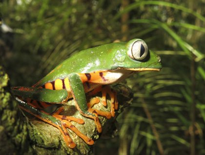 After a hearty breakfast back on board we got out again, this time to hike in the forest, in an area that never gets flooded called tierra firme. We learned about some of the myriad plant species and got the chance to observe some very interesting creatures, including several frog, insect, and snake species. A wonderful tree frog, with orange under parts and black tiger-like stripes, as well as a great boa constrictor posed for the photographers, whereas a huge mata-palo tree provided an amazing background for jungle portraits.