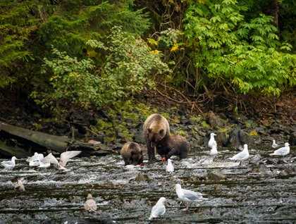 We awakened this morning aboard National Geographic Sea Lion to overcast but dry skies. Mist clung to the trees along the shoreline as the ship anchored off Pavlof Harbor, where we planned to spend our morning. In the spring and early summer we take hikes here along a large stream with gushing waterfall, through the beautiful forest and meadows, and around a great lake. But by mid-summer the focus of our outing shifts. The salmon begin to fill the stream, swimming up to spawn, and attracting all manner of wildlife to feed. Especially bears.  Our plan was to shuttle ashore and keep vigil on the stream in the hope that at least one hungry bear would show up to fish. We stood in a condensed area along one side of the bank downstream, and watched in amazement as a mother and her two cubs fished and shared their meal, and another solitary bear fished and swam. Another solitary bear that had been there initially, wandered off into the forest, and later, another appeared. The staff held the perimeter of our group and kept watch of the bears, their movements, and also the edges along the forest and the stream in all directions. Wow! What an amazing opportunity to watch these massive creatures go about their daily business, and avoid and interact with each other. Towards the end of our viewing the solitary bear charged at the mom and her two cubs, who ran into the forest alongside where we were standing. We moved our group quickly downstream to the waiting expedition crafts, donned life jackets, and left shore. What an incredible encounter! Back onboard we gathered in the lounge for a presentation and discussion about the remarkable role that salmon play in the Pacific Northwest ecosystem.
