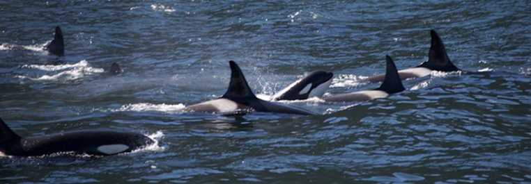 What a morning! What a surprise! Orcas! Even before the morning wake-up call, we encountered orcas. We thought it was a small group, but after a while we noticed a series of killer whales blowing in the distance, then another group and so on… The pod we were watching could easily have been composed of 18 animals, adults and young, and very young. Males and females. We slowly followed them for a while, definitely modifying our early morning plans. Our whale expert, Dr. Andy Szabo informed us about their lives, their behavior and their food tastes. These animals were of the fish-eating groups, the so-called residents. Big pods compose these animals. Their behavior showed us that they were capturing their food, big salmon.