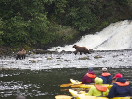 Congratulations, you have arrived for a trip of a lifetime in Southeast Alaska. We dove into the wildlife sightings first thing this morning. First with the whales, then a fleeting glimpse of a brown bear on Admiralty Island. Patience was rewarded this afternoon. Our introductory meander into the temperate rain forest turned into a marathon bear-watching event. We sent out our different paced walks, which most at some point in time stopped from high and low forest perches to observed the first, then second, and ultimately the third brown bear that came out to feed at the waterfall. It seemed that the longest hike was to be bear-less, but fear not, they found a bear in the woods, and the bears fishing at the falls had yet to be satiated by the time the more intrepid hikers returned. We bobbed in kayaks, floated in little black rubber boats, and gazed appreciatively from the shore at the fishing bruins.