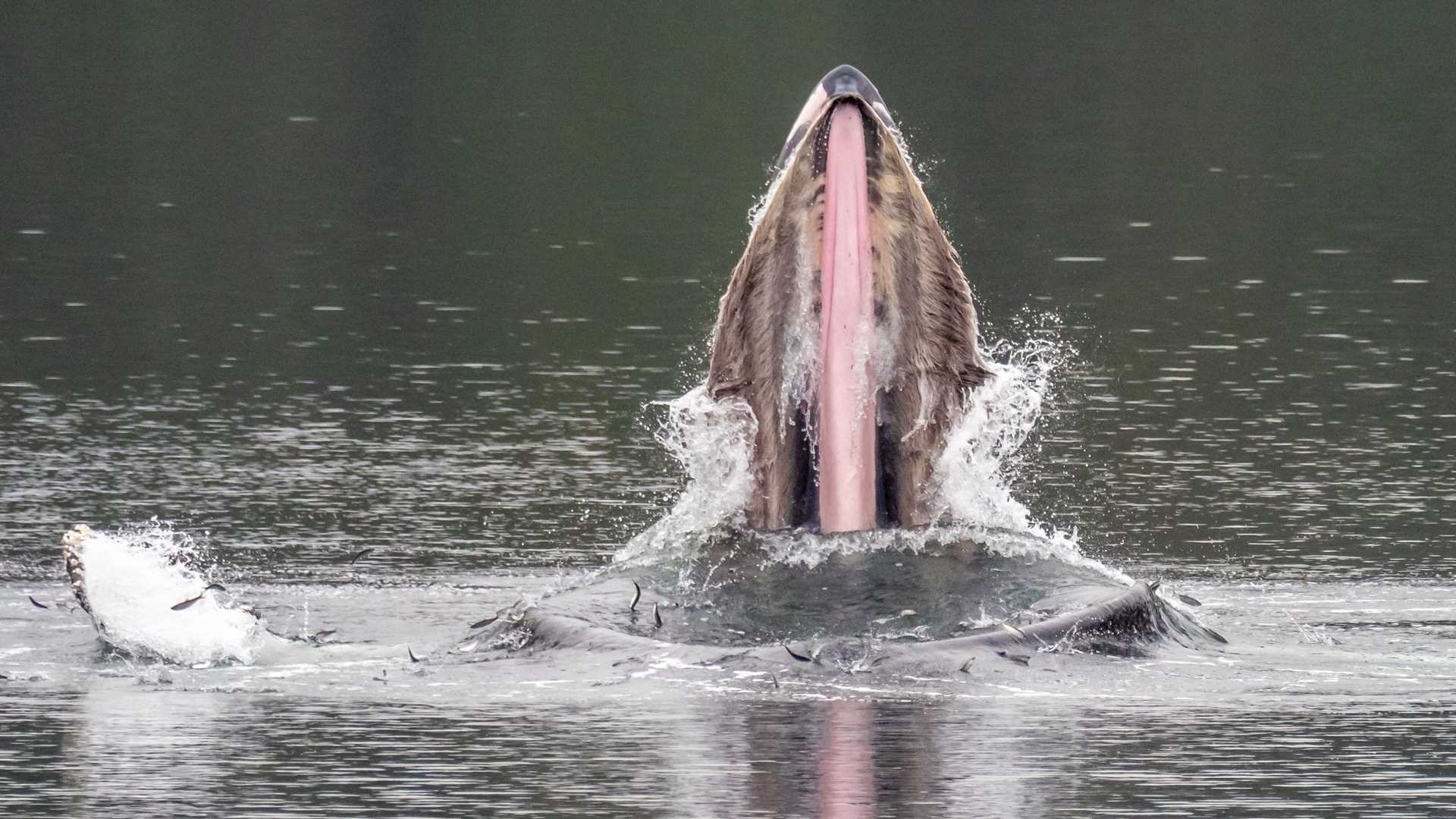 After a foggy passage through Sergius Narrows, National Geographic Venture was making a scenic trip through Peril Strait when a humpback whale was spotted. We came to a stop to see what this whale was up to, and what a great choice that was. The whale was blowing bubbles in a circle underwater for over two minutes. These bubbles rose to the surface in an ever-constricting net, and then the whale burst to the surface, mouth agape. Herring were seen leaping into the air, some escaping, while many more went into the mouth of the whale. We watched this incredible show of intelligence quite a few times. We were amazed by the perfect circles and the beautiful pink inside the mouth of the whale.