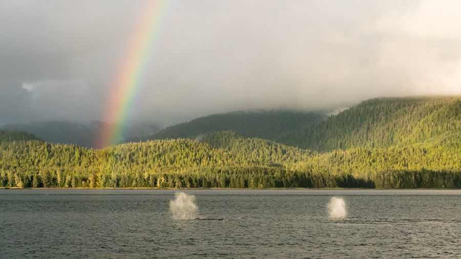 Boarding our ship for an afternoon of searching for marine mammals, we struck gold…perhaps, literally. Because, at the end of the rainbow, we began to see multiple columnar blows in a close grouping, a sign that humpback whales were cooperative feeding. Approaching with wonder, the rainbow grew brighter and so did our hope to see one of the most spectacular events available to witness in nature. The whales did not disappoint: calling out to the hydrophone we had in the water before lunging to the surface for a mouthful of their prey. The sky grew spectacular, and we held to the bow even as the rain fell hard and the light grew low. It is not often that one gets to witness nature in such raw spectacle.