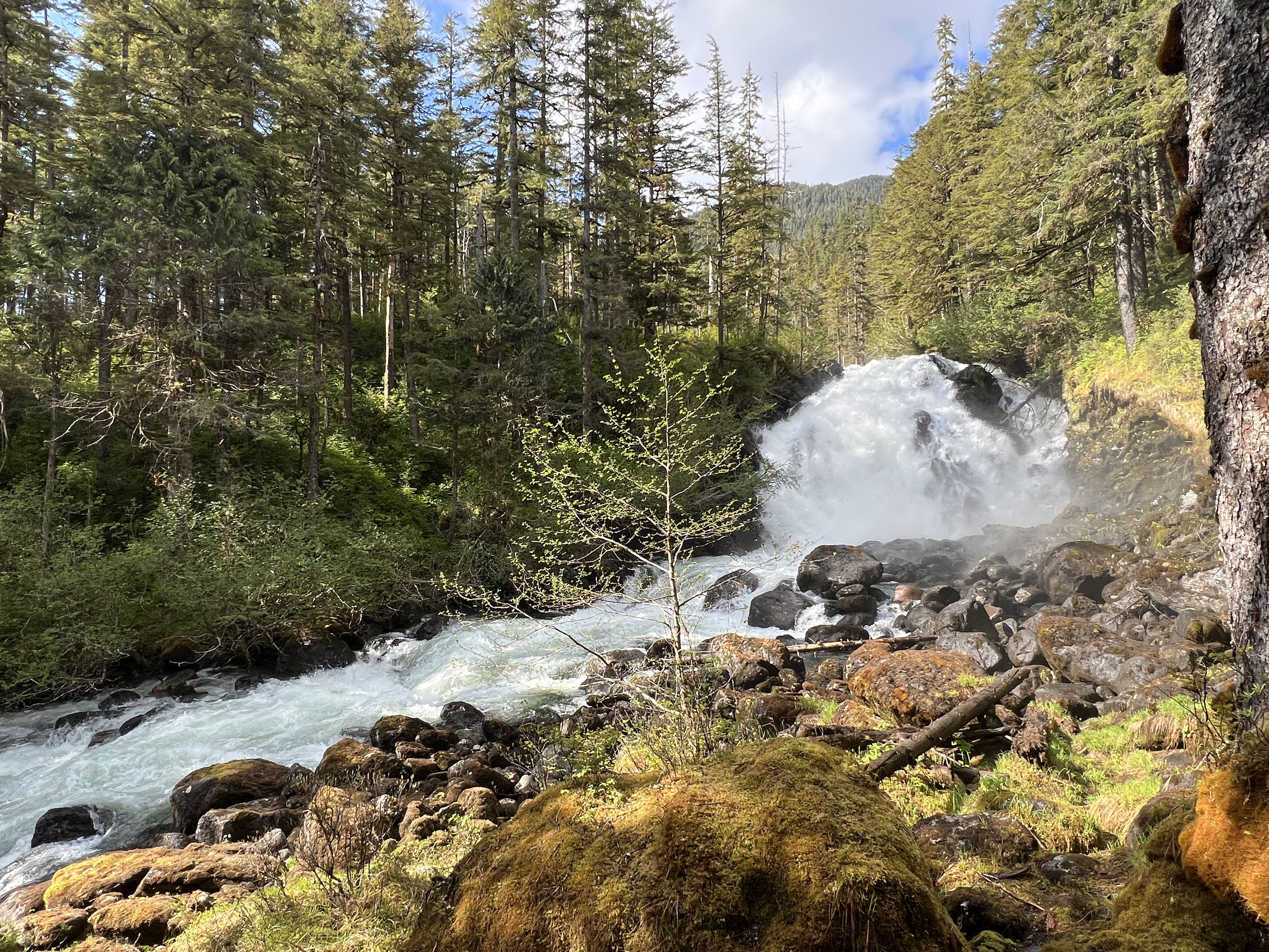 The afternoon brought us to the nearby anchorage of Thomas Bay, where we went for a glorious hike at Cascade Creek. This densely forested trail meanders up the river to the lowest set of falls. A large cascading waterfall misted the group. Stone steps serpentined up the hillside, leading to a switchback forest trail. Eventually, we made it to a bridge where folks crossed the raging river with a view of the falls.