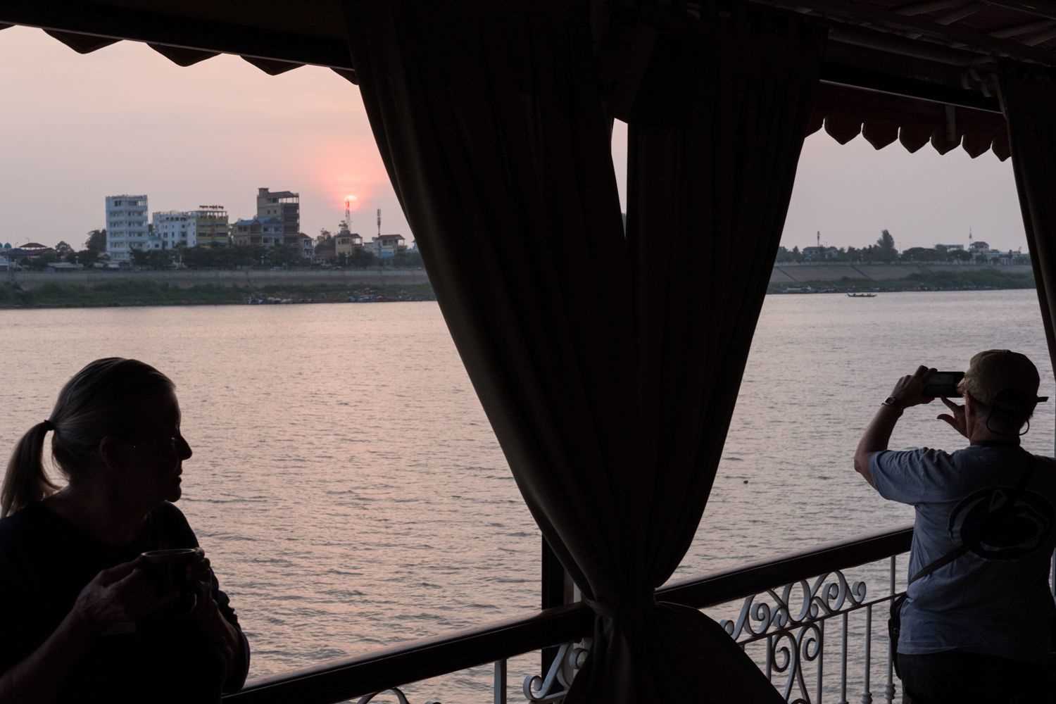 This morning, Jahan was docked at the Cambodian capital, Phnom Penh, and we had one more opportunity to explore the city and see it come to life. The enthusiastic early-bird guests, and birders, ventured out for “golden hour” photography at sunrise followed by wildlife viewing. We first made a stop along an esplanade that overlooks the Tonle Sap River. Photographers honed their skills with gorgeous colors, silhouettes and buzzing action shots of traffic or passersby. We continued our walk near Wat Phnom, where there is a large colony of flying foxes roosting in a tree.
