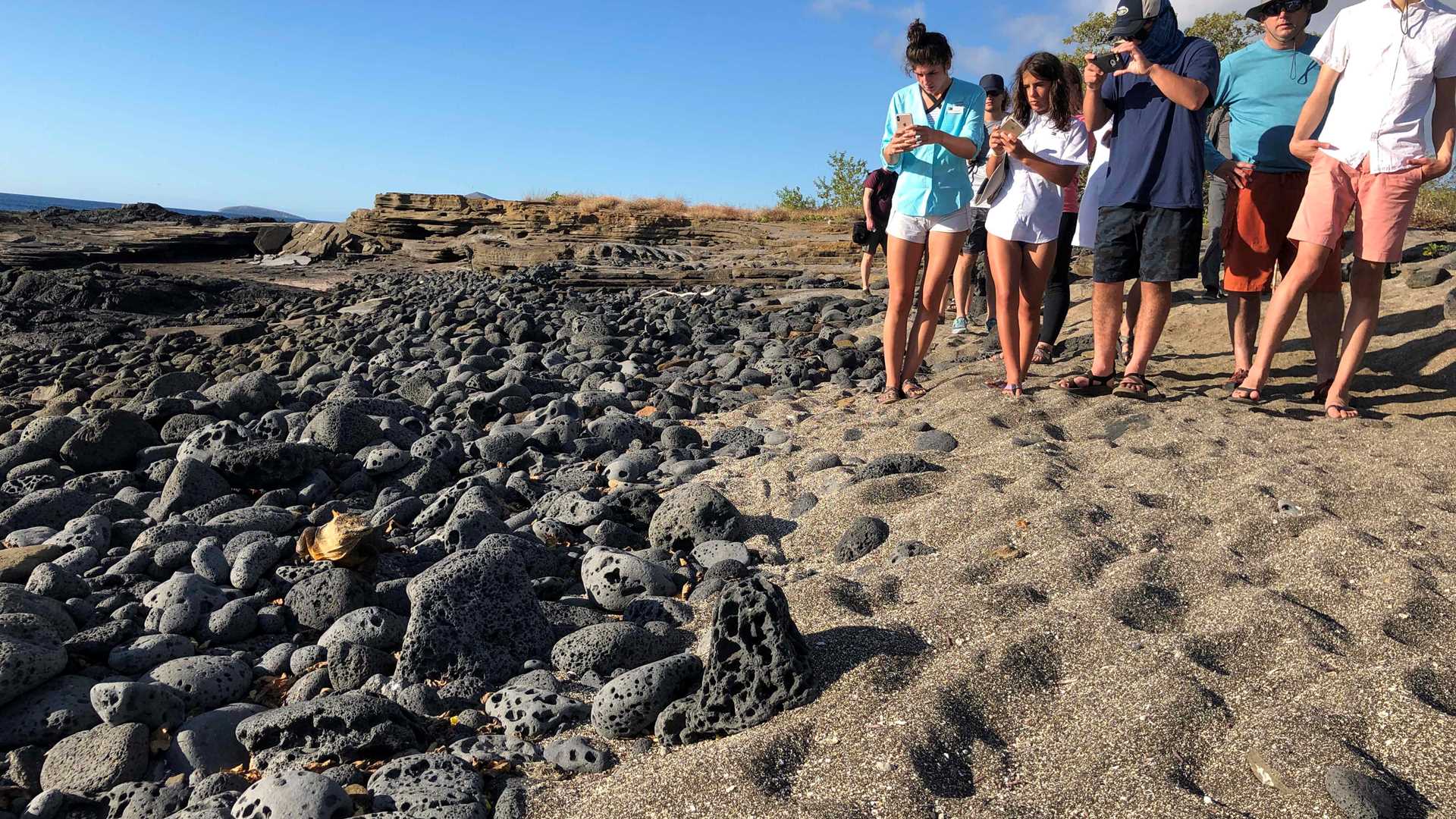 In the afternoon, we disembarked at Puerto Egas. Guests had the opportunity to snorkel at the beach where they sighted sea lions and sea turtles. After our time at the beach, we went on a lovely sunset walk along the coastline to observe Galapagos fur seals, grottos, and a variety of shorebirds. But perhaps the most interesting sighting of the afternoon were the newly repatriated land iguanas. Only two months ago, the Galapagos National Park released 1,500 Galapagos land iguanas to Santiago which were previously extinct from this island for decades as a result of human influence. Guests learned about the history of voyagers that frequented Galapagos for centuries, leaving behind devastatingly invasive animals such as goats and pigs. Today there is great hope that we will achieve a thriving population of land iguanas once again in Santiago Island.