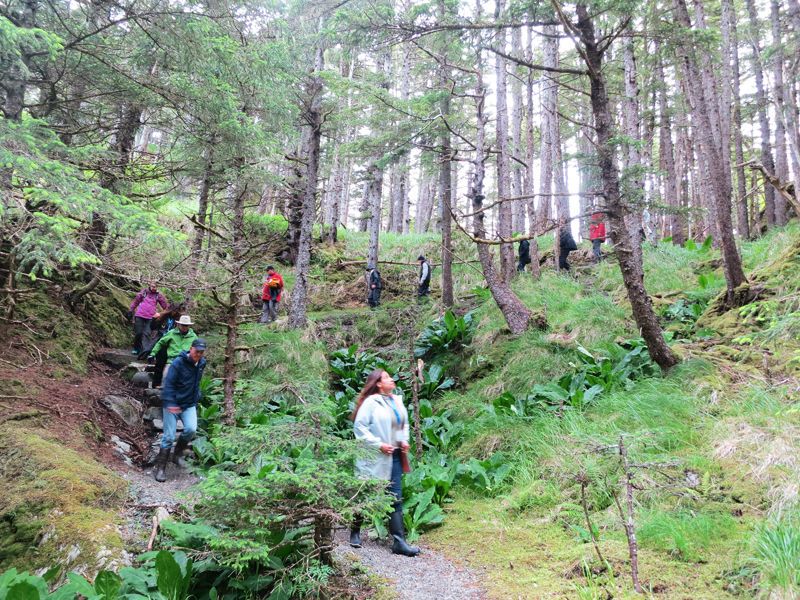 We woke to pretty clouds above the tree-covered hills as we sailed into Idaho Inlet, seeking wildlife. After breakfast, we landed at Fox Creek and hiked into a small waterfall along a salmon stream, through stately spruce and hemlock trees. The temperature was cool in the forest and black-capped chickadees sang to us as we walked along. Kayakers paddled in a beautiful cove with mirror-like waters, and other guests headed out on a cruise along the shoreline to search for wildlife and birds. It was a stunning morning. We sailed to the Inian Islands anchorage during lunch, and soon we were launching our expedition landing crafts to explore. The waters of the Inian Islands and Cross Sound are rich with nutrients due to the mix of upwelling currents and flooding tides, providing a wonderful food source for marine wildlife and seabirds. On this wonderful day, we saw Steller sea lions, sea otters, many humpback whales, and a minke whale. Late in the afternoon, we sailed over near Elfin Cove and went ashore to explore this picturesque and quaint fishing village on foot, making friends with the local dogs and talking with fisherman as we walked along the boardwalks of town.