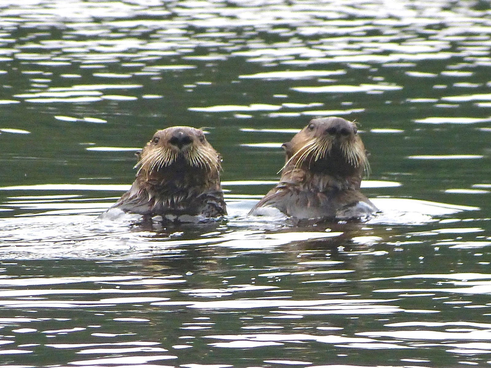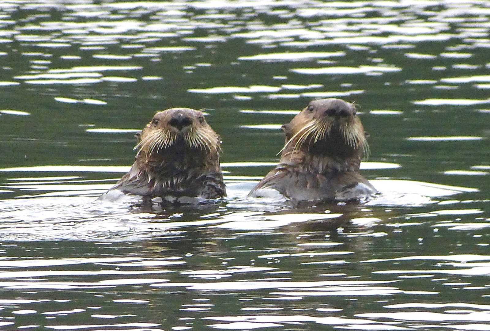 When Russians colonized Alaska in the mid-1700s following the voyage of Vitus Bering, it was for only one thing: the incredibly rich pelts of sea otters.  These large members of the weasel family differ from most other marine mammals in using dense fur rather than blubber to keep warm, and this was very nearly the cause of their demise.  In little more than a century, Russian hunters (or, more correctly, Aleut hunters under the control of the Russian American Company) had reduced the population of sea otters nearly to extinction.  This morning, as we sailed through Icy Strait, we saw plenty of evidence that their abundance has recovered.  Sea otters spend most of their surface time floating on their backs, buoyed by air trapped in the fur, with their rear feet sticking up into the air.  They are constantly active, busily grooming their fur and then diving into the kelp beds for prey, perhaps a sea urchin, a crab, an octopus, or a sea star.