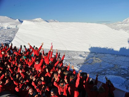 Towards dinner we sailed deeper into the ice of Lapeyrere Bay, parked the ship while we ate our final dinner in the Antarctic Peninsula before starting our sail north towards Ushuaia, Argentina. Lisa called for all guests to come on the bow, dressed in their red parkas, for a final group photo in front of the glacier ice. The captain sailed the ship in such a way as to cast a shadow of the ship’s profiles along the side of an iceberg. This was a spectacular way to say our final farewell and end our remarkable journey to the White Continent.