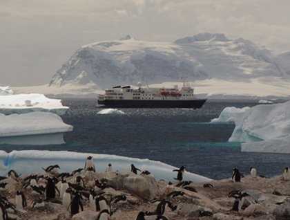 In the afternoon, we landed at Cuverville Island for our last up-close look at Antarctica. Some of the guests took Zodiac rides along the shore to see swimming penguins and the awesome icebergs, one of which split in two with a big bang. Most of us arrived on land for a last walk in Antarctica. There were several gentoo penguin colonies spread out along the shore. The penguins were coming in and out of the ocean, walking up and down on their “penguin highways,” and sitting on eggs in their rock nests. Meanwhile, there were menacing skuas flying around. There was even a wedding, as two guests were married on shore by the captain! The views in this bay were magnificent, with jagged black peaks of igneous rock soaring out of the glaciated white landscape.