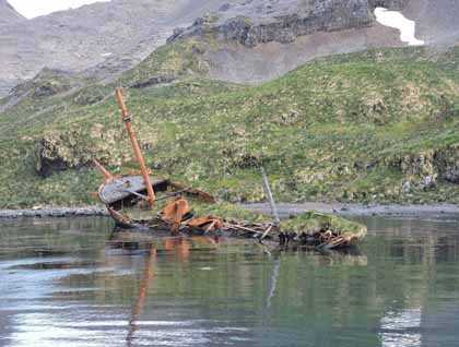In 1911, a whaling station was set up here, but for the first few years all the processing of whale carcasses took place on a steam-powered factory ship called Restitution that was moored in the bay each summer.  This lasted until she was wrecked in the Isles of Scilly off Cornwall, England, in 1916.  After that, a slipway was constructed and all whale processing took place on land, similar to what we saw at Grytviken a couple days ago.  An old three-masted bark called Brutus (built in Glasgow in 1883) was purchased for use as a coaling ship after she was retired from the South American nitrate trade.  She remains there today as a wrecked hulk near the ruins of the whaling station.
