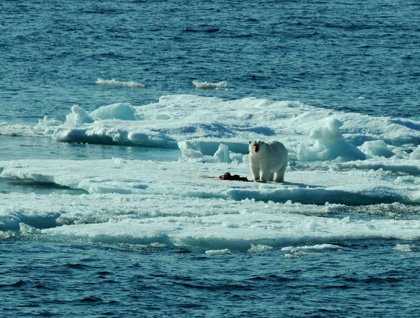 We had several presentations during the day. Later in the day, however, the skies cleared enough for us to encounter another polar bear with a kill. This, what we assumed was a younger, very healthy male, was chewing on what was left of a seal as we approached a small string of ice floes. Our appearance caused him to decide that eating time was over and he retrieved the carcass and began swimming away with it. We allowed the animal to depart and we did the same, off towards another adventure in the sea ice of Nunavut.