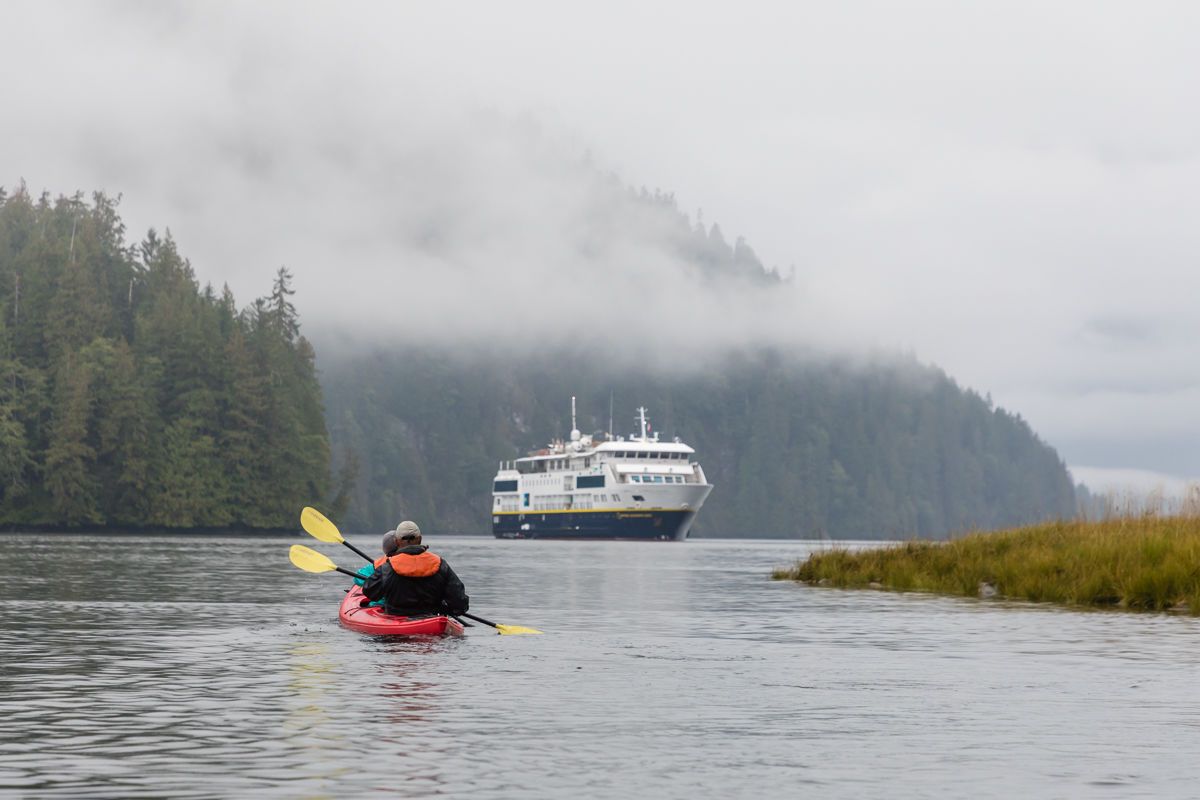We woke at 6 a.m. aboard National Geographic Sea Bird as we reached our Canadian checkpoint in Prince Rupert on the western coast of British Columbia. Canadian customs agents boarded the ship and then cleared us to set off in our expedition landing crafts to explore the town. We spent the morning and early afternoon walking about this sleepy port village, visiting the Museum of Northern British Columbia and perusing the shops, business-front murals, and cafés. Prince Rupert has a population of more than 12,000 people and is one of the deepest water ports on the western Canadian coast. The city is served by a road system, the Alaska Marine Highway, and a rail system that serves mainland Canada, delivering goods that arrive from overseas by container ship. After we departed, we cruised along the Canadian Inside Passage, watching for wildlife as cumulus clouds built up and drifted overhead, and we passed what at first glance appeared to be a barge adrift in the sound. We realized that in fact what we were seeing was a light station situated on an island in the shape of a small ship. Onto Hecate Strait and Haida Gwaii.