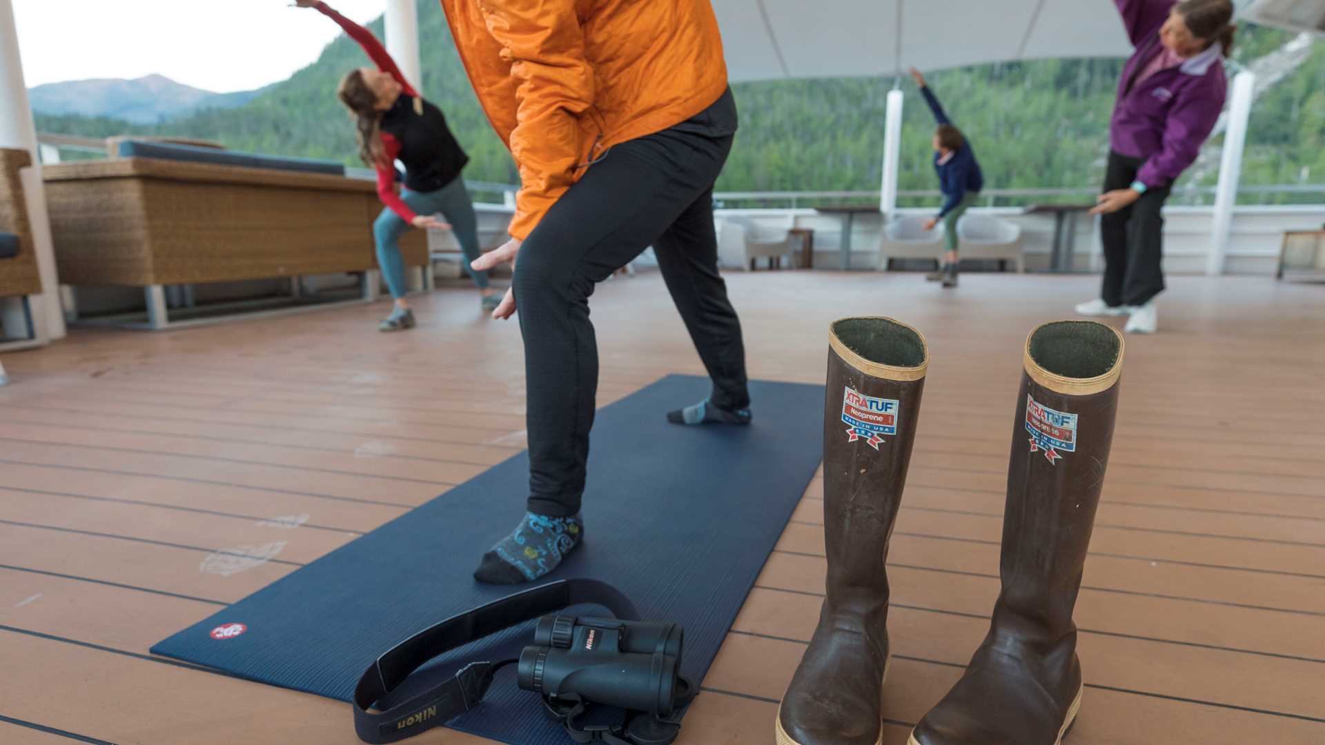We woke to a calm, crisp, and clear morning. National Geographic Venture was anchored in Cougar Bay, a small inlet off Princess Royal Channel on the Inside Passage, a marine highway that traverses the wild coast of British Columbia. My day as the Wellness Specialist began outdoors on our spacious sundeck, where I led a gentle early morning stretch class for guests to limber up their muscles for the day ahead. After breakfast, I joined the rest of the field staff team on the bow, aiming our binoculars towards the shore and out to sea in search of terrestrial and marine wildlife. To everyone’s delight, our patience and diligence were rewarded by the thrilling sites of whale blows and the unmistakable dorsal fins of a pod of killer whales passing by. We were excited to see a solo humpback appear. The whale fed in the nutrient rich waters along this pristine coastline. What an amazing marine mammal encounter to start our day.