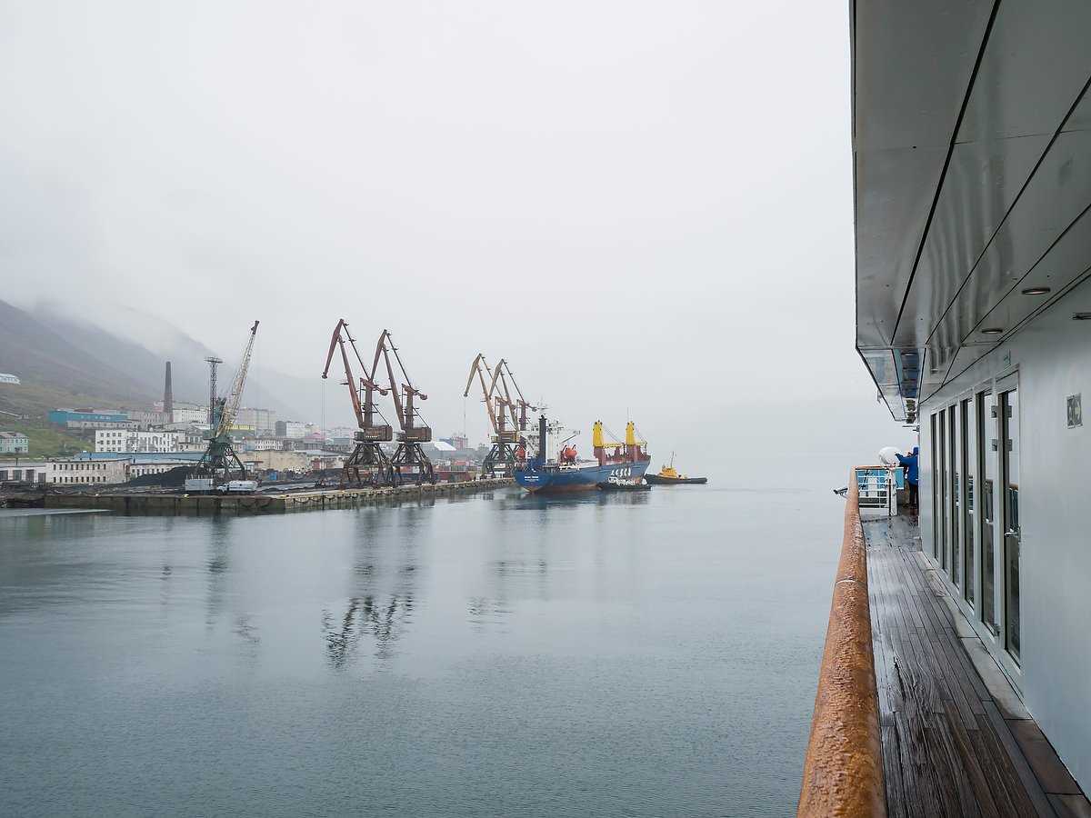 Heavy fog accompanied National Geographic Orion in the harbor in the city of Provideniya, Chukotka today. With a population of just under 2,000 inhabitants, this former town was once a bustling farming and leather tanning location. Just a few years ago there were almost 10,000 people living between both sides of Provideniya Harbor.