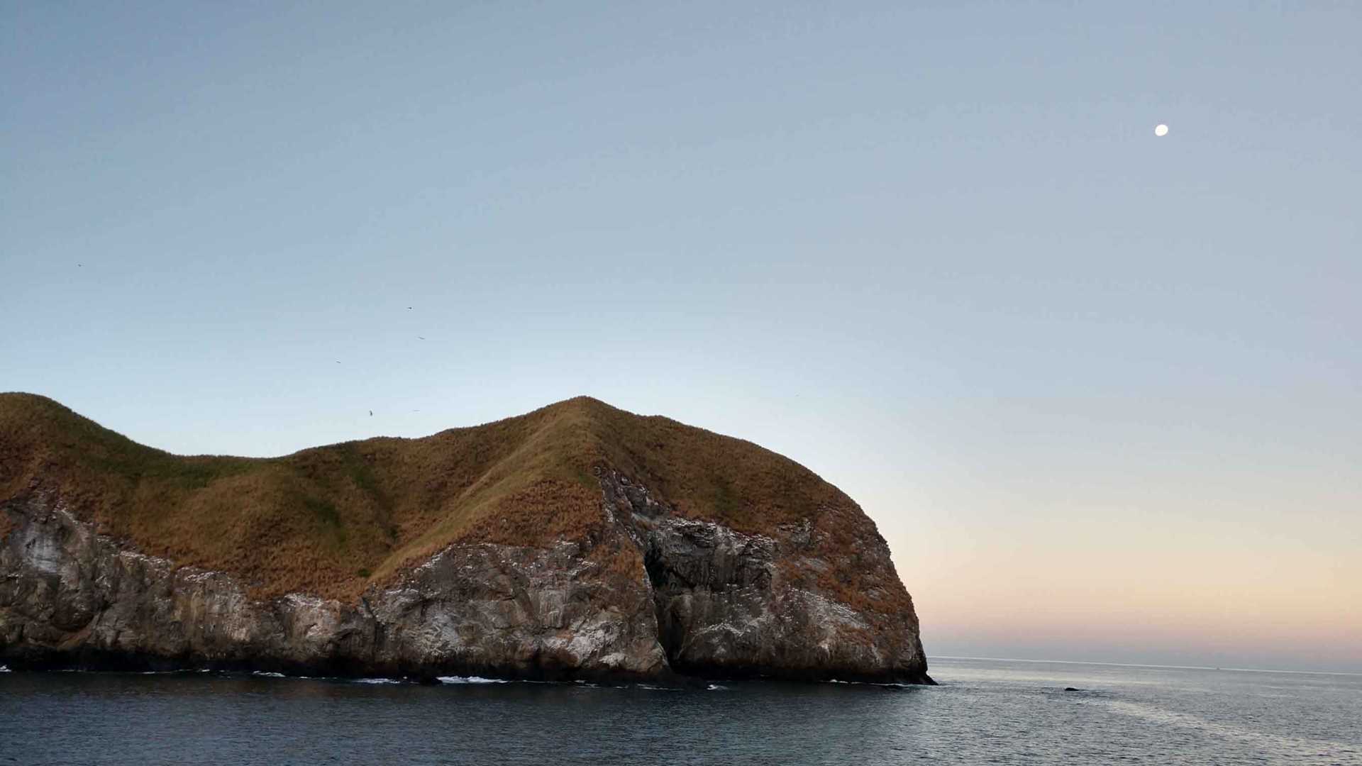 As we neared our point of anchorage in Punta Zapotal, third mate Pataky and Captain Davis decided to give us a terrific entrée to the eye this morning, bringing us in view of the Catalina Islands. For the first time in our ship’s history, we were witnessing from the bow Catalina’s flora and fauna. Magnificent frigate birds and brown boobies flew over the islands as the moon set off the horizon. Fantastico!